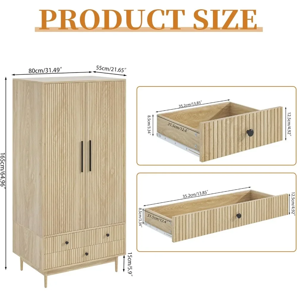 Wardrobe Closet with 2 Fluted Doors Wardrobe Cabinet with Shelves and Hanging Rod Freestanding Clost Modern Wooden with Drawers