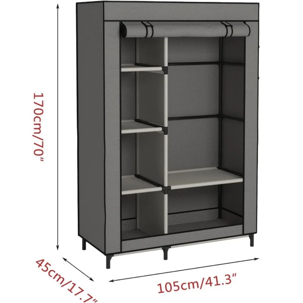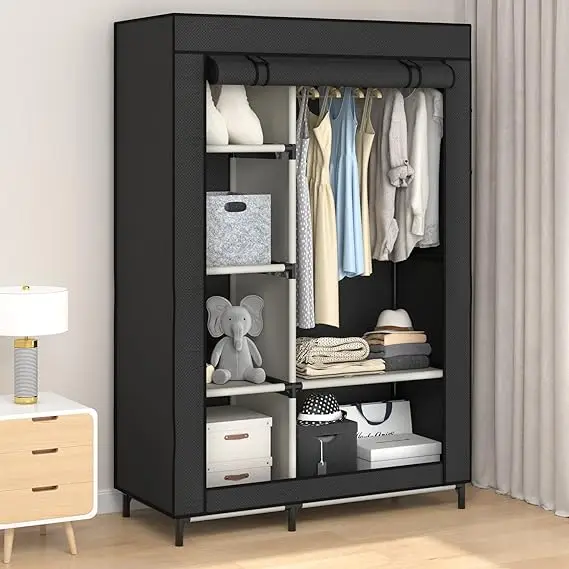 - 【Multifunctional canvas wardrobe】The wardrobe has five compartments and a hanging area. The small compartment can store many small items, such as clothes, shoes, bags, pet supplies, etc. There is a large space in the hanging area for clothes that are long or easy to be creased.