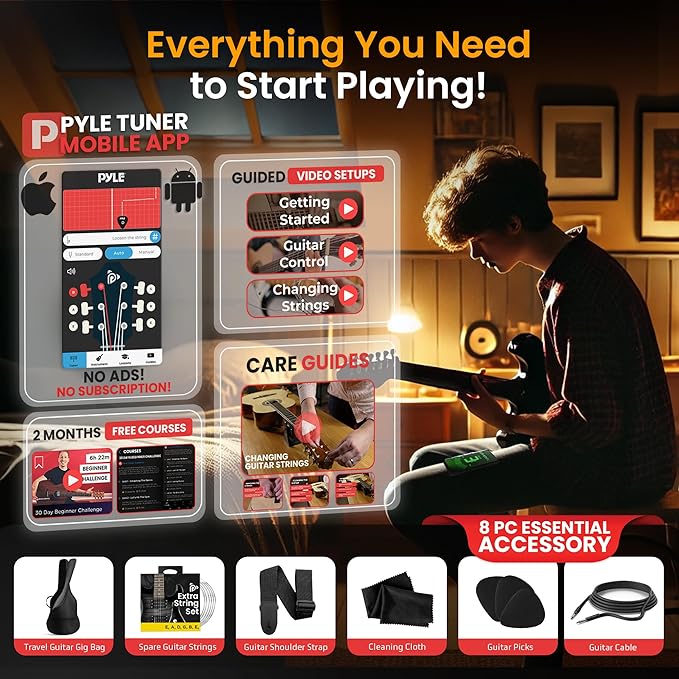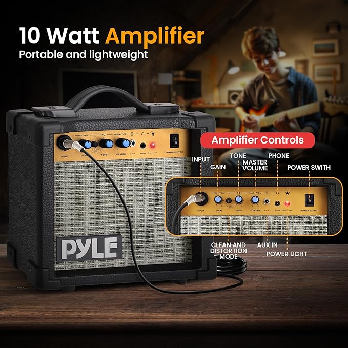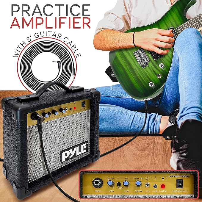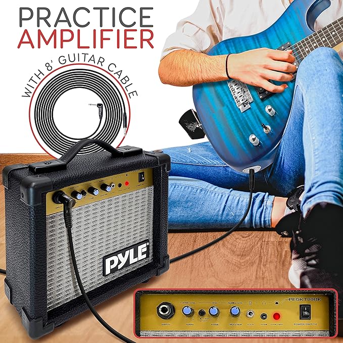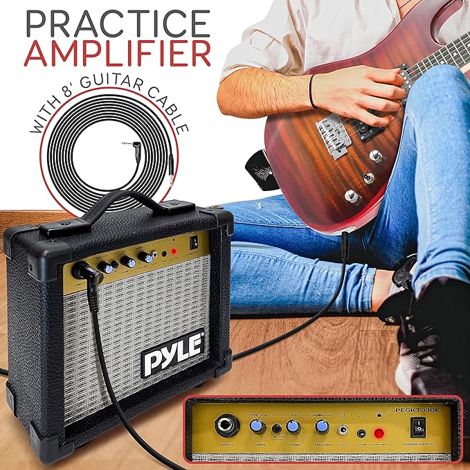 - AMPLIFICADOR DE PRÁCTICA INCLUIDO: Con interruptor de distorsión, control de volumen, agudos y graves. Salida para auriculares para práctica silenciosa. Respuesta mejorada de alta frecuencia. Portátil y ligero para fácil transporte.