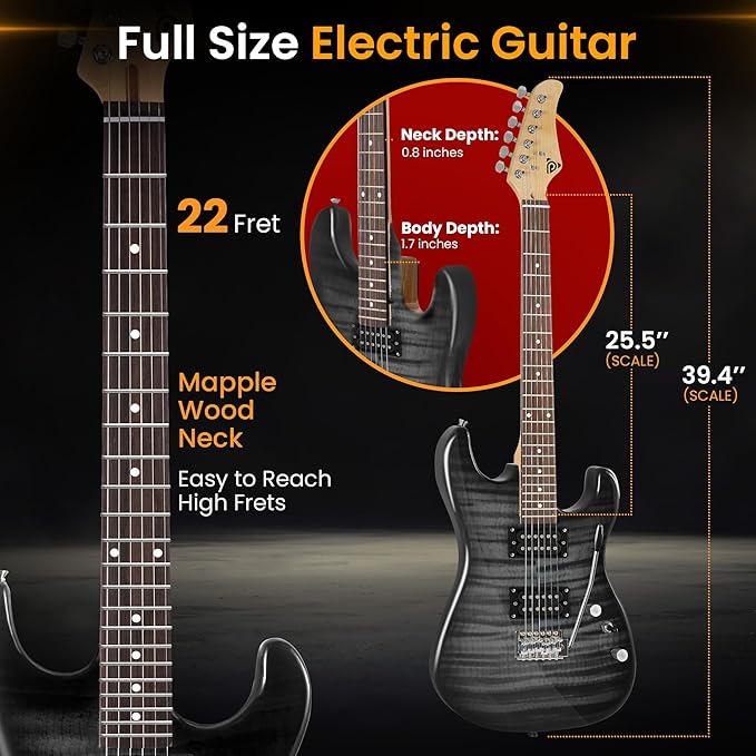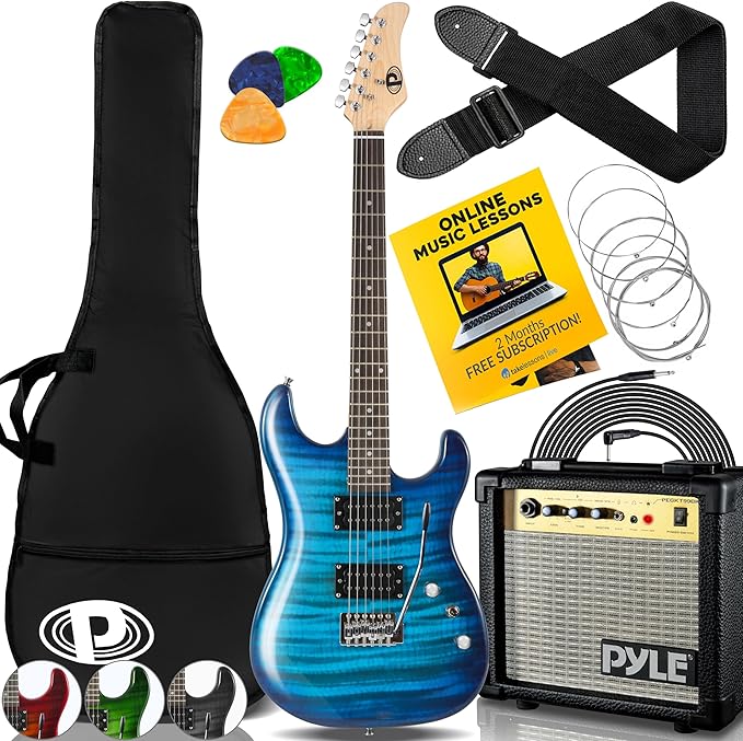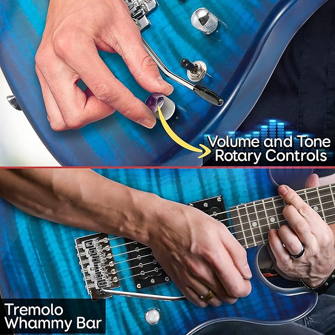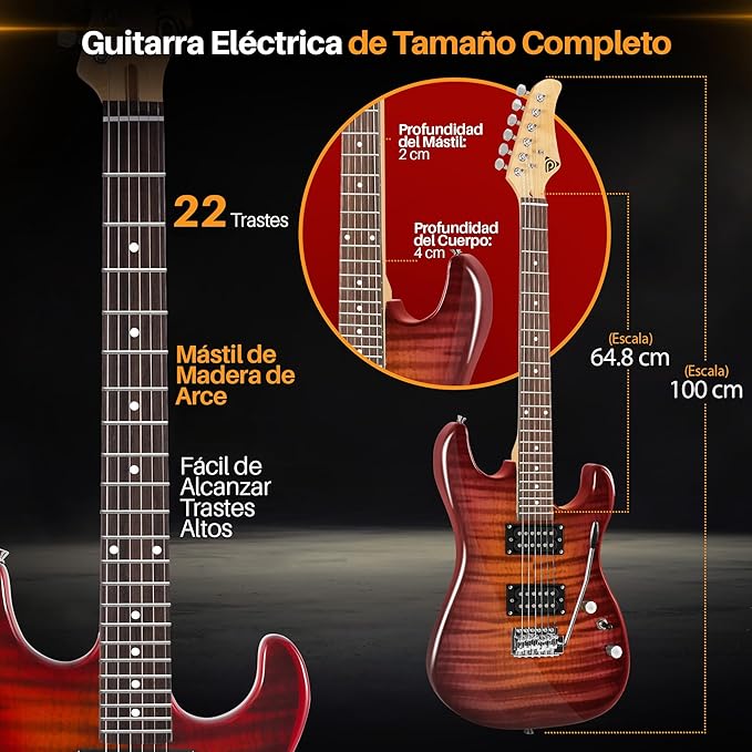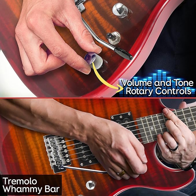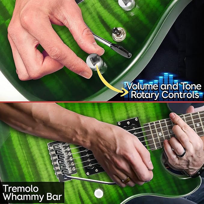 - KIT COMPLETO PARA PRINCIPIANTES: Incluye una guitarra eléctrica de tamaño completo ideal para clases, bandas, presentaciones o práctica en casa. Incluye amplificador, cable de ¼", barra de trémolo, funda, cuerdas extra de guitarra eléctrica, correa y afinador digital.