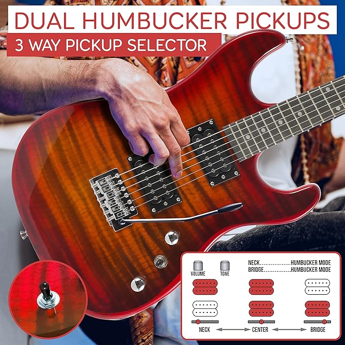 - PASTILLAS HUMBUCKER DOBLES: Las pastillas Humbucker tienen dos bobinas que rechazan el ruido y las interferencias mediante cancelación de fase. El resultado es un sonido más profundo, fuerte y suave en comparación con las bobinas simples más baratas.