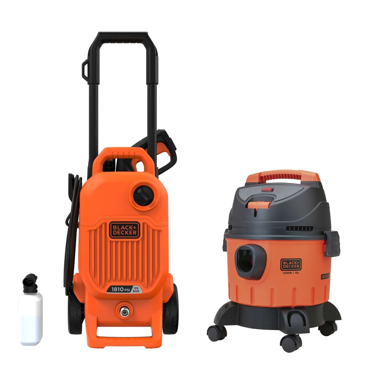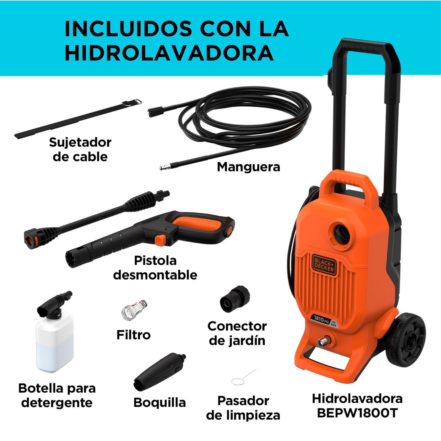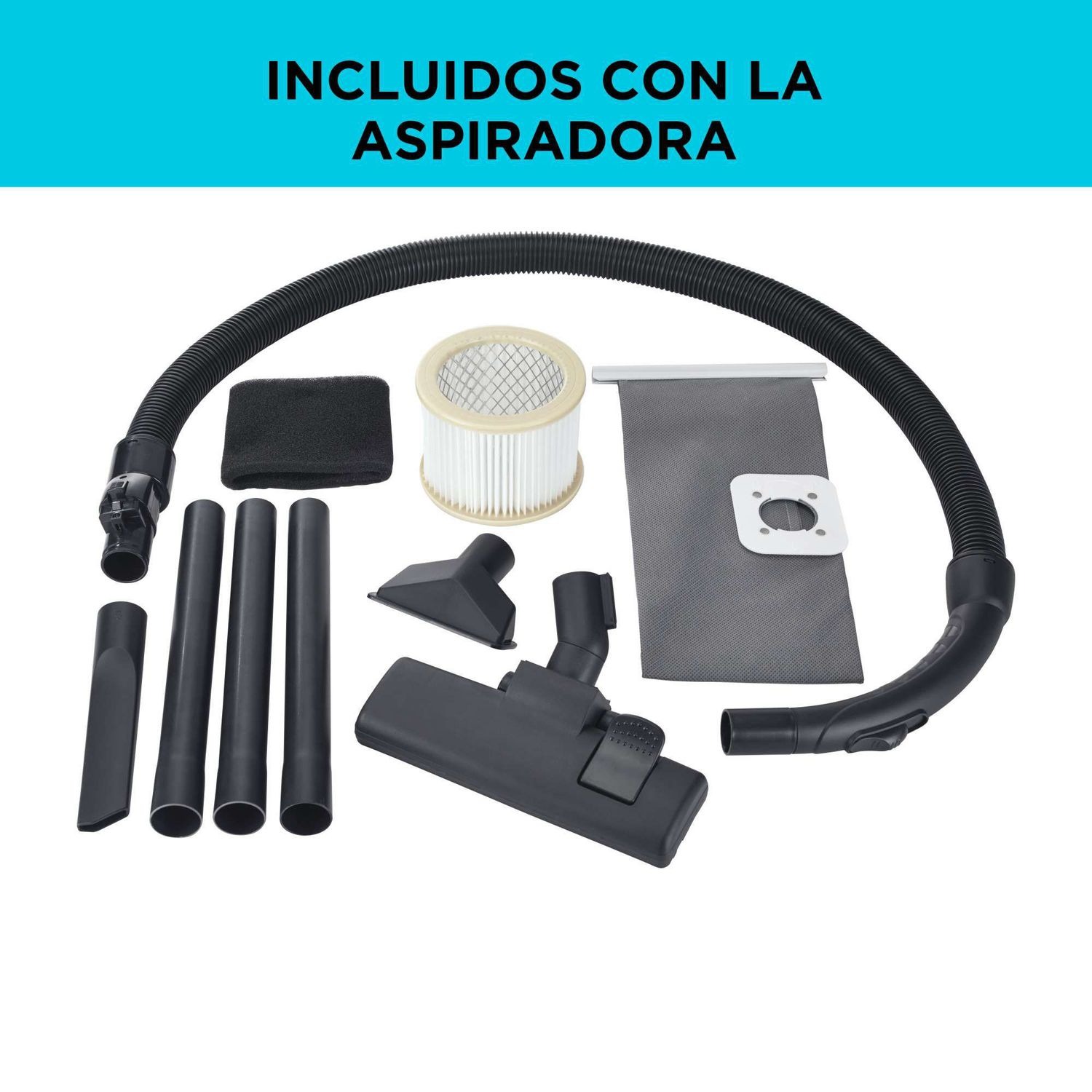 Aspiradora, Manguera flexible (1.5 mt), Cepillo para sofá, Cepillo para piso, Boquilla para hendiduras, 3 Tubos para extensión, 4 Ruedas para traslado, Bolsa lavable para el polvo, Filtro HEPA, Cubierta para filtro HEPA, Filtro esponja, Cable (3 m). Unidad de lavado de alta presión, Manguera de presión de 6 m, Pistola de gatillo, Lanza con boquilla ajustable, Filtro de agua, Conexión rápida, Botella de espuma, Pasador de limpieza de la boquilla. |