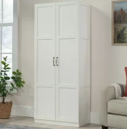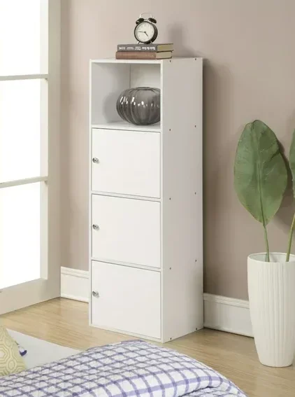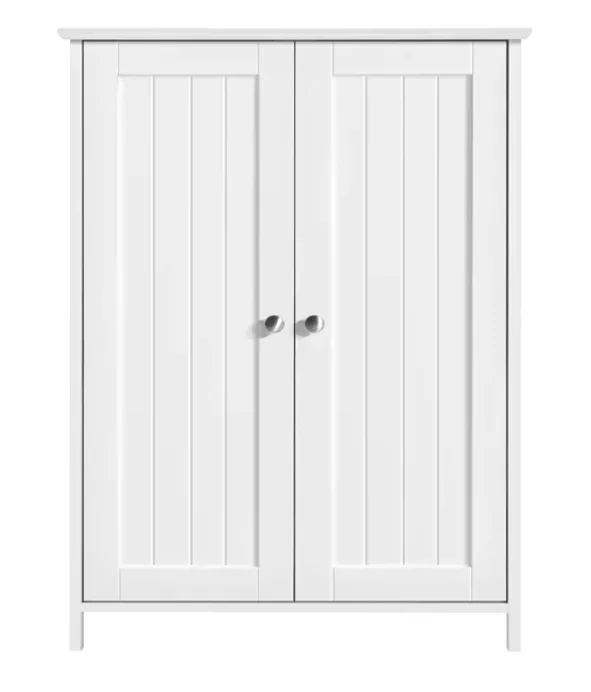 Behind 2 doors are 4 shelves (3 adjustable) to keep items organized from office supplies to nonperishable foods and extra linens